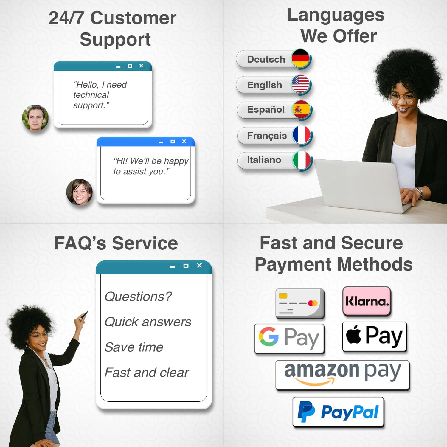 Unsere Mission ist es, Ihnen ein nahtloses Erlebnis zu bieten. Deshalb bieten wir blitzschnellen 2-Minuten-Versand an. Unser engagiertes, mehrsprachiges Kundenservice-Team steht Ihnen rund um die Uhr zur Verfügung, um Ihnen jederzeit umfassende Fachkenntnisse zu bieten, ob per Live-Chat oder E-Mail.